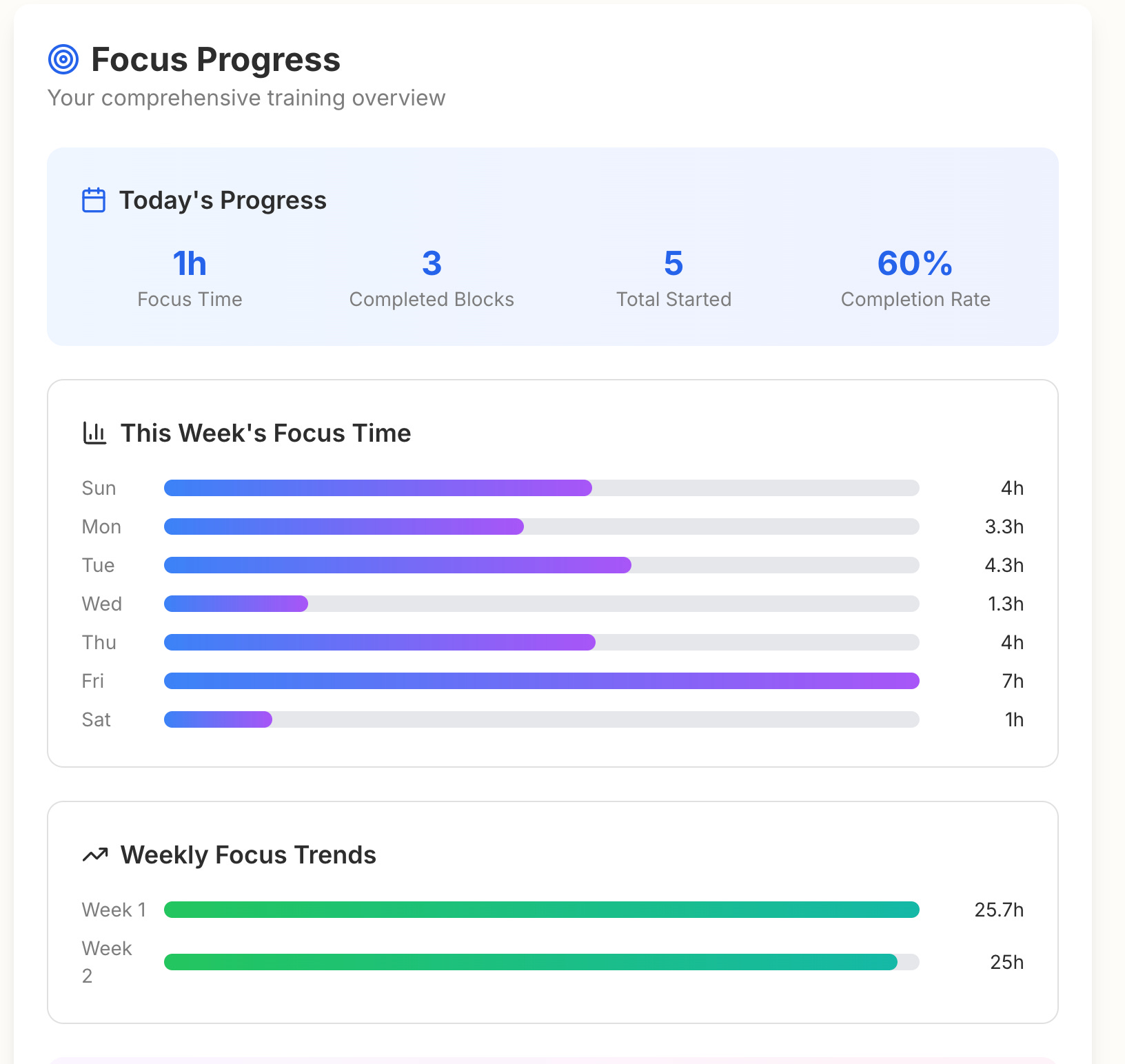 A self-adjusting Pomodoro Timer with comprehensive analytics to track your focus progress and growth over days, weeks, and months.