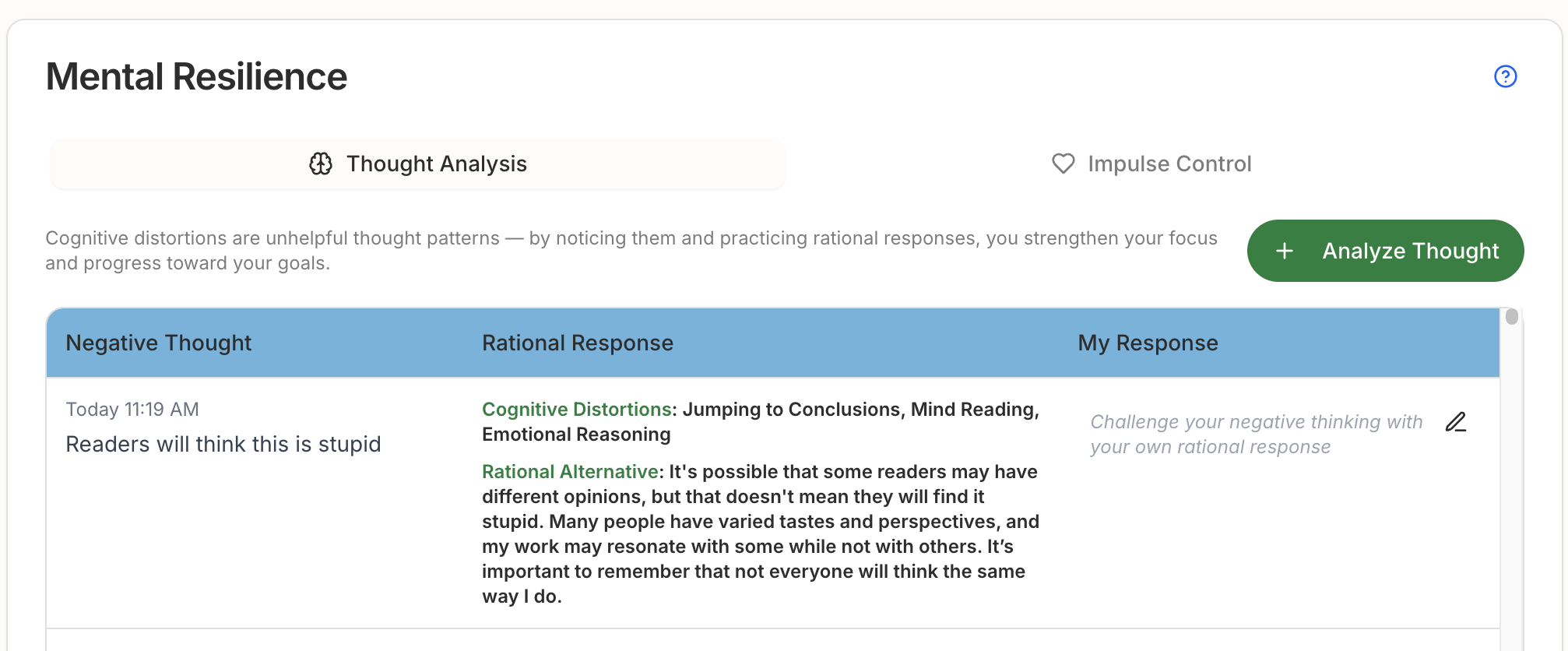 A place to capture negative thoughts and have it auto-generate rational responses using CBT principles.